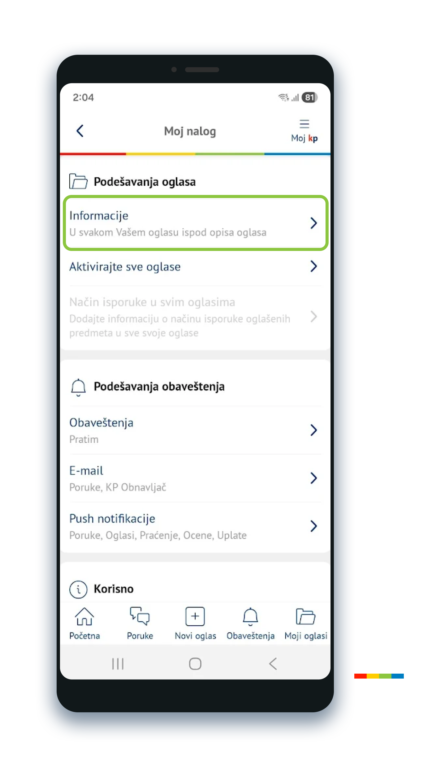 Opcija Informacije u oglasima Vam omogućava da na jednostavan način, u jednom koraku, dodate bitne informacije u sve svoje oglase odjednom. Sve što je potrebno jeste da odete u Moj KP > Moj nalog > Podešavanja oglasa > Informacije i kliknete na Informacije (U svakom Vašem oglasu ispod opisa oglasa).